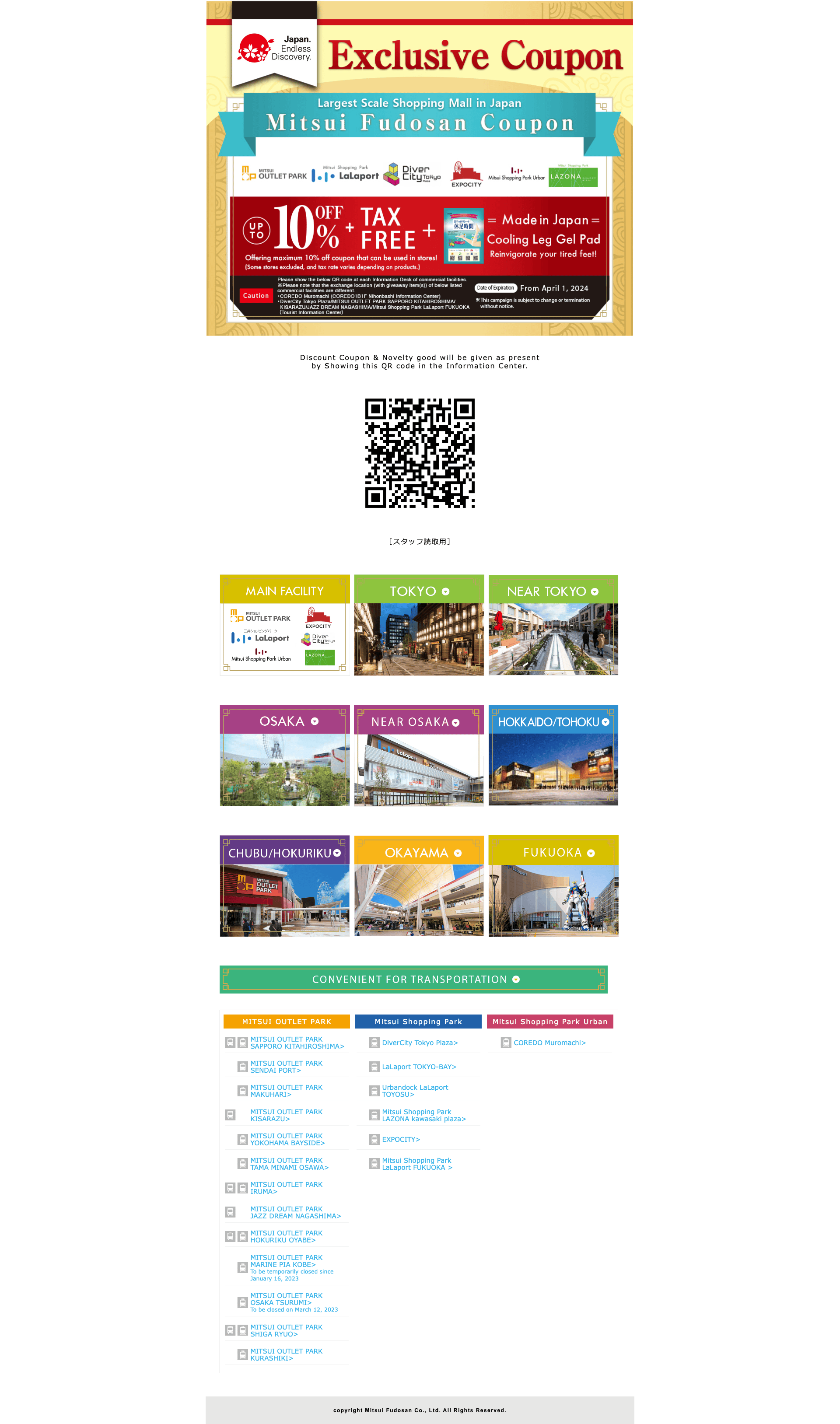 Present the coupon at the information counter of participating Mitsui outlet malls to receive discount coupons.