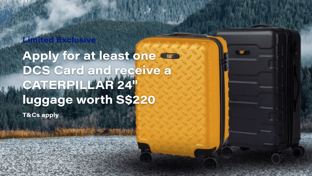 Receive a choice of gift for either : one CATERPILLAR Sulphur 24” Industrial Plate or one CATERPILLAR Black Tank 24” luggage bag worth S$220