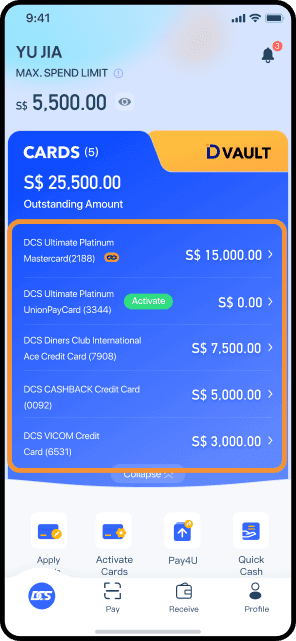 You can also make instant fund transfers from your DCS Cards to your designated bank account.