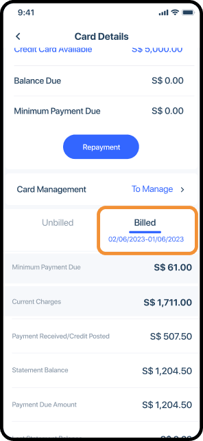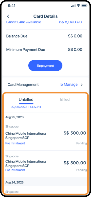 This leads to the Card Details page where the full list of transactions that are yet to be billed (Unbilled) can be seen. Repayment amounts are also reflected here.