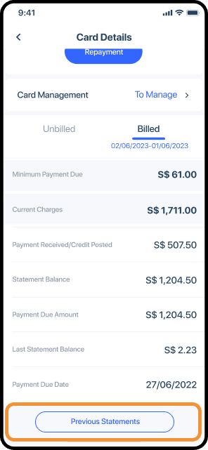 To view your latest statement, tap on 'Billed', then tap on 'Previous Statements'.